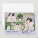 Tack för det vackra bröllop-kortet i pastelliserad lila med ett fotokollage som du kan lägga till fem av dina bröllop-foton i. Tack för att du är skriven i ett fantastiskt calligraphy-skript i högernas hörn i grund, med slingor. Lägg till datum och plats för namn och bröllop i ett teckensnitt för elegant. Baksidan är infogad så att du kan skriva ett personligt meddelande för hand.