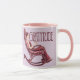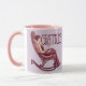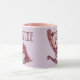 This mug displays a stylized Art Nouveau illustration of a woman in a burgundy dress sitting in a rocking chair on a lavender background. The woman is in profile view, reclining in the chair with eyes closed and one hand in a meditation pose. The rocking chair features elaborate curved wooden details with decorative scrollwork and a fan-like ornament at the top. The text GRATITUDE appears in burgundy letters at the top of the image. The illustration has a vintage, decorative quality with a color palette of burgundy, pink and lavender tones. The chair's design includes flowing curves and natural motifs typical of the Art Nouveau style. The image is on both sides of the mug. The mug is a pink and white combo mug. The mug has a pink handle and a pink glaze interior.