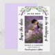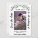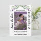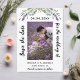 Ett modernt bröllop spara datum-fotokort. Dekoreras med laverings blommigtar, blommor och eukalyptus greenery. Anpassa och lägg till ditt foto, datum, namn.