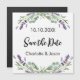 En Spara datum magneter för dina bröllop gäster. En snyggt vit bakgrund som dekoreras med lavender-blommor och eukalyptus greenery. Anpassa och lägg till datum för namn och bröllop.