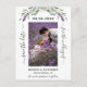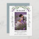 Ett modernt bröllop spara datum-fotokort. Dekoreras med laverings blommigtar, blommor och eukalyptus greenery. Anpassa och lägg till ditt foto, datum, namn. Baksida: grått grönt, färg, vykort.