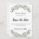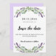 En modern och elegant Spara datum för ett bröllop. En vit bakgrund som dekoreras med lavender-blommor och eukalyptus grey. Anpassa och lägg till ett datum och din namn. Texten: Spara datumet skrivs med ett stort trendig-handskript i stil. Bakåt: Bakgrund för lavender-färgad