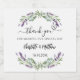 En snyggt vit bakgrund som dekoreras med lavender-blommor och eukalyptus greenery. Anpassa och lägg till datum för namn och bröllop. Med texten: Tack för att ni delar vår speciella dag.
