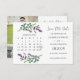 Lavender Eucalyptus Spara datumkalendern. Denna utformning har en vattenfärgad illustration av lila lavender-blommor och eukalyptus-blad. Texten "Spara datumet" skrivs i ett skript-teckensnitt. Du kan redigera datum, år och månad för kalendern. Ladda upp en bild och lägg den på baksidan.