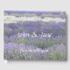 Gästboken i anpassade bröllop med fält av lila- och vitlavendelblommor.