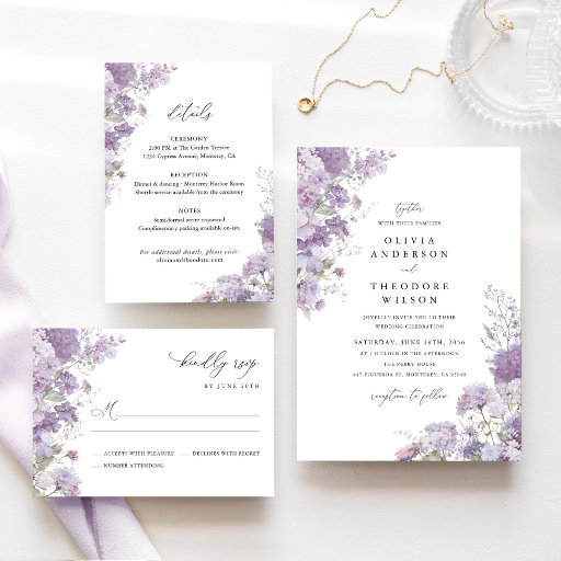Matching RSVP cards, details cards, welcome signs, seating charts, and coordinated day-of stationery are available in the same lavender floral collection to create a cohesive wedding paper suite.