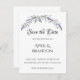 En elegant- och vintage som innehåller elfenbensfärgat ro, eukalyptus och lavender som är målade i romantiska vattenfärger. Spara datuminbjudningar.