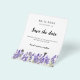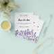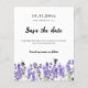 Observera att det här Spara datumet är pappert och mycket tunt. Kuvert ingår inte. Om du vill ha tjockare Spara datumkort (samma design) kan du besöka vår butik. En modern och elegant Spara datum för ett bröllop. En vit bakgrund som dekoreras med vattenfärgade lavender-blommor. Anpassa och lägg till ett datum och din namn. Texten: Spara datumet skrivs med ett stort trendig-handskript i stil. Bakåt: Bakgrund för lavender-färgaden.