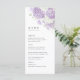 Lavender and white floral wedding menu card featuring soft watercolor hydrangea and lilac blooms.