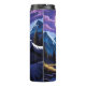 En solitär, majestät varg med piercing gult ögon ligger på en bergig strand bredvid en lugn sjö, och dess huvud höjdes i en sorglig hulling mot en stor, strålande lavender-färgad fullt måne. Snöberg stiga upp i avstånd under en djup lila natt himmel, prickad med kloka moln och några stjärnor, vilket ger en känsla av tyst vildhet i coolan Arizona.