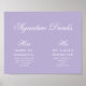 En enkel lavender Namnteckning Drinks bröllop-tecken. Bakgrunden är lavender (lätt lila), ett mycket modernt färg. All text är vit. Rubriken Namnteckning Drinks och undertexterna "Hers" och "Hans" skrivs i ett kalligrafiskt skript för elegant, resten med versaler.