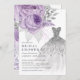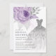 Vacker lavender och silver blommigt inbjudningskort för möhippan med en glamorös bröllop klänning. Vänd över möhippan inbjudan om du vill visa en samordnande blommigt tillbaka för en speciell beröring i extra