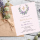 Rosa bakgrund. En blommigt krans av lavender-blommor, vattenfärgad eukalyptus grenery och ett gyllene kor. Anpassa och lägg till namn och detaljer. 1 lakan = 1 inbjudan tryckt kant till kant.