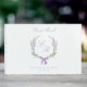 Ett söt bröllop gäst bok med en vattenfärgad hästskosisk krans av lavendelblommor med en lilac coquette-buk. Monogrammet finns i det traditionella skriptteckensnittet i lilac i mitten. Anpassa dig ytterligare med namn och bröllop.