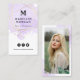 Söt monogrammat affärskort med ditt initialvärde i svart mot stänk av blekens lila vattenfärg inuti det bleka geometriska linjerna av Faux guld. Lägg till mediehandtaget för social under moderna svarta och vita ikoner. I bakgrunden kan du lägga till ett foto.