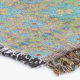 Ett komplext mönster har upprepade geometriska former i mjuka nyanser av blått, grönt och gult. Den symmetriska utformningen skapar en visuellt fängslande bandeffekt.