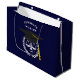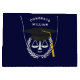 Skolväska i kreativ studenten med en unik skiva av rättvisa i svart och guld på marin blå bakgrund. Så här anpassar du redigeringstexten för att lägga till namn i juristgrad.