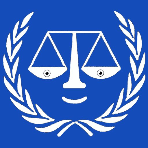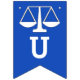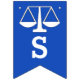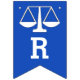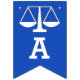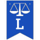 Advokatskolans banderoll i studenten grattis, med en blå bakgrund i Scales of Justice.