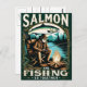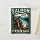 En färglös illustration som skildrar en fiskare sitta med en campingbrand med en lax i bakgrunden. Bilden visar på en fredlig
