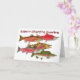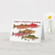 Humoristiskt kort som presenterar 5 art av nord - amerikanLax som visas all i lekregalier. Sockeye, Chinook, kamrat, Coho & puckelrygg. Från original- vattenfärgstudier av naturkonstnären Glace Thom.