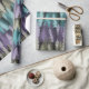An illustration of layered pine trees arranged in horizontal bands, featuring cool teal, lavender, olive, and charcoal shades.