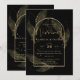 Vi presenterar en elegant formell svart tie bröllopsdetalj med svarta och gyllene färger prydda med ömtåliga gyllene skelettblad som överlappar kanterna på en välvd ram. Denna design är en del av en samordnad samling och inkluderar föremål som RSVP-kort, "spara datum"-kort, inbjudningar, välkomstskyltar, klistermärken, servetter, program, bordskort, presentpåsar, menyer och etiketter för vinflaskor, samt en mängd olika kort- och papperstyper för att passa alla budgetar.