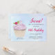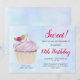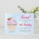En födelsedagsinbjudan med en illustration av en läcker cupcake med rosa virvlar och en jordgubbe med blad inklämd i glasyren. Ställd på en ljusblå pastell vattenfärg bakgrund.