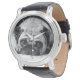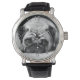 Svart och vitt fotografi av en mycket ädel liten pug med soulful brun ögon.