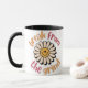 En kaffekopp med en glad blomillustration och frasen "Pausera från vardagen" centrerad runt bilden. Designen förmedlar en glad och upplyftande känsla som en flykt från dagliga påfrestningar.