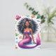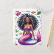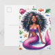 Det här livfulla fantasipostkortet har akvarellkonst med en "svart" havsjungfru omgiven av marint liv. Det mörkbruna hudfärgade sjöjungfru-väsendet poserar på havets botten med ett vackert leende och bär en lila topp. Hon har en fjällig rosa svans och är omgiven av fiskar, sjöstjärnor, bubblor och andra havsvarelser och botaniska element. Den vackra havsjungfrun har tjockt, långt, naturligt lockigt hår som fläktar ut från sitt strålande, melaninrika ansikte i den undervattensscen som avbildas.