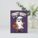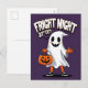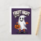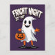 En glad och kuslig Halloween-kort med en rolig, tecknad spöke som håller en ljus orange jack-o'-lantern-sockerhink. Designen använder en djup lila bakgrund med fet "FRIGHT NIGHT 31ST OCT"-text. Detta vertikala kort är perfekt för en vänlig Halloween-fest inbjudan, en allmän säsongs hälsning eller ett tillkännagivande för ett barn trick-or-treat-event. Dess tilltalande, icke-skrämmande stil är bra för alla åldrar.