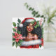 Akvarellkonst visar en vacker brunskalig kvinna som bär en tomtehatt och en röd tomteliknande klänning i kombination med texten "God Jul" (avtagbar/anpassningsbar) mot en bakgrund av julstjärna och järneksträd. Hon ler varmt och stirrar på betraktaren.
