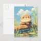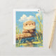 Det här hjärtliga vykortet visar en glad, luddig utter som tittar över en strukturerad stock på en ljus och solig dag. Konsten är gjord i en mjuk, lysande akvarellstil som blandar en livfull palett av himmelblått, gyllene bärnsten och vårgrönt. Luddiga vita moln driver genom en klar blå himmel medan gröna näckrosblad flyter i det glittrande vattnet nedanför. Det varma ljuset och de måleriska texturerna skapar en glad och inbjudande stämning. Det här vykortet är ett underbart val för att skicka en solig hälsning, ett uppmuntrande meddelande eller ett lekfullt "tankar på dig"-meddelande.