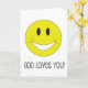 Detta inspirera, lyckliga och kristna hälsningkort presenterar ett leendeansikte med "guden älskar dig!", text.