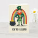 This card shows a cheerful leprechaun standing in the center with his hands on his hips, dressed in an emerald green suit and tall top hat marked with a shamrock ☘️. His rosy cheeks, bright red beard, and wide grin feel like a friendly wink to someone you care about, as if he’s posing just for them. The jacket has shiny golden buttons and trim, and his trousers carry a faint pattern that adds texture without crowding the scene. Behind him, a rainbow 🌈 arcs across the background in clear color bands, framing him like a spotlight. Near the rainbow’s end sits a rounded dark pot overflowing with gold coins, and a slim walking stick rests off to the side as a small extra detail. Along the bottom, the message “YOU’RE A LEGEND” is set in black, all caps, centered beneath the illustration. The background stays a soft creamy tone, making the greens, golds, and rainbow colors stand out, with the pot of gold tucked near the lower edge under the rainbow’s curve.