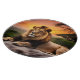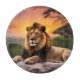 Vackert Lejon som lägger på en sten med djungelsolnedgång bakom
