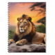 Vacker lejon som ligger på en sten med solnedgång i djungeln bakom