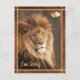 Nära en vacker lejon ansikte. Grymt stor kattbild. Med en text som säger "jag är så ledsen" i ett beige färg. Underbart att be om ursäkt, känna eller beklaga, särskilt för ett misstag eller misstag eller för att känna sorg, sorg, sympati, medlidande, sorg, olycka eller besvikelse, särskilt för att något obehagligt har hänt eller gjorts. Med en texturerad, rustisk, grym, mörk brun bakgrund och guld pub som ramar bild. Varje inslag kan flyttat runt, ändras eller tas bort. Fotografi av Wildcat älskare.