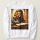 Generera en bild av en lejon man med glasögon och skriv på ett plagg med en tunn penna. Scenen är i en fantastisk värld.