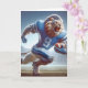 En lejon i en fotbollsuniform #9 anklagar ett fält med lätt upplyst fotboll och håller en fotboll med beslutsamhet och energi. Inre text kan ändras.