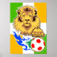 En afrikansk Lejon med tass på en lysande fotboll, boll och flammor ligger i färg i södra Afrikan och i bakgrunden i en flagga med färgen Grönt White och Guld.