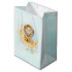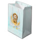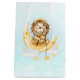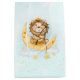 Grattis på födelsedagen presentsäck med en söt illustration av vattenfärg. En berömvärd lejon som har krona som fiskar efter stjärnorna sitta på ett halvmånigt måne vilar på ett fluffmoln. En massa faux guld-folie stjärnor vid molnen ge, detta är en magisk känsla. Ljusblå vattenfärgsbakgrund.