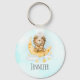 En nyckelring med en söt illustration av vattenfärgen. En berömvärd lejon som har krona som fiskar efter stjärnorna sitta på ett halvmånigt måne vilar på ett fluffmoln. Magisk fantasi. Ljusblå vattenfärgsbakgrund.