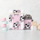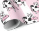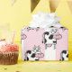 En roligt giftig djurtrycksdesign med en leende ko mot en bred strimlad bakgrund i rosa och vitt.