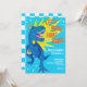 Framsidan på ett födelsedagsinbjudningskort med en lekfull blå dinosaurie som bär en festhatt och håller en cupcake. Texten lyder, "Låt oss göra lite oväsen! Richard fyller 5!" Baksidan visar ett blått och vitt rutmönster. Tonen är rolig och festlig.