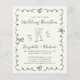 Retroinspirerat ljust krämfärgat budgetbröllopsinbjudan med grön vågig scallopram dekorerad med koketta band, fantasifulla handritade illustrationer av hjärtan och champagneglas, samt "Bröllopsfest" och namnen på bruden och brudgummen i ett roligt, lekfullt grönt typsnitt. OBS: Detta budgetvänliga papper är tunt, liknande i vikt som fotopapper - en större och tjockare 5x7 traditionell kartongversion finns också tillgänglig (skicka oss ett meddelande för länken).