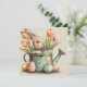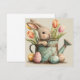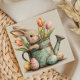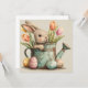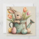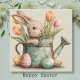 En charmig akvarellillustration av en lekfull påskharen som tittar ut från en gammal vattenslang fylld med färska vårstulpanter. Omgiven av mjukt dekorerade pastellfärgade ägg fångar scenen de milda färgerna och den glada känslan av påsk och den tysta skönheten i en vårträdgård.