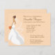 En brunett, bruna ögon brud tittar blygt över axeln på en persikofärgad damast mönstrad bakgrund. Din anpassade djup orange text sveper runt henne. Information om gåvor går på baksidan. Finns i alternativa färger med ett urval av hud/hår/öga färger för bruden. Matchande tackkort, presenter och porto finns tillgängliga. Kontakta mig via min butik om du föredrar en annan bakgrund.