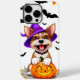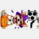 Lekfull seriehund med glad uttryck, iförd en lila häxhatt. Hunden sitter framför en utskuren pumpa med ett glatt, leende ansikte. Runt hunden ligger färgglada majskorn utspridda på marken, och flera fladdermöss som flyger i bakgrunden förstärker Halloween-temat