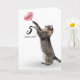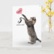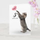 Grått tabby katt med rosa hjärtballong för femårsdagen på vit bakgrund. Bakgrunden till färg kan ändras